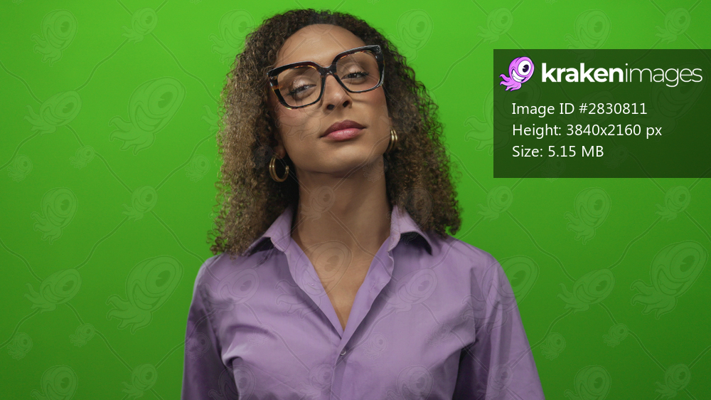 Transgender woman wearing glasses extends her hand for a handshake in a vibrant green studio backdrop; confidence.