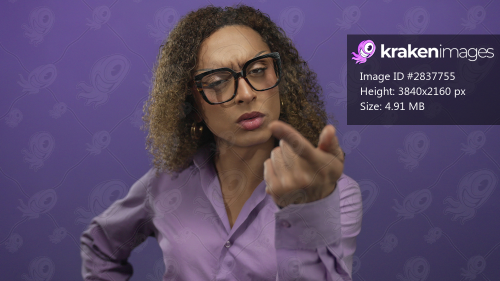 Transgender woman wearing glasses gestures finger toward viewer in purple studio setting; frustration.