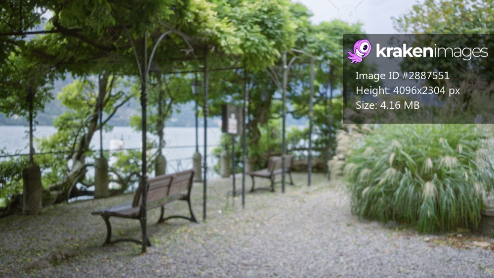 Trellised lakeside park scene with wooden benches, gravel path, leafy pergola and ornamental grasses, soft defocused bokeh and gentle blur for mood, park; background backdrop copyspace calm. - Kraken Images