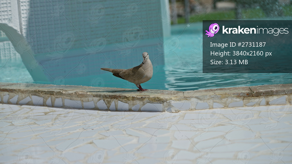 Turtle dove stands by a clear blue poolside under the sunny sky, showcasing serene outdoor beauty and natural tranquillity in a peaceful environment.