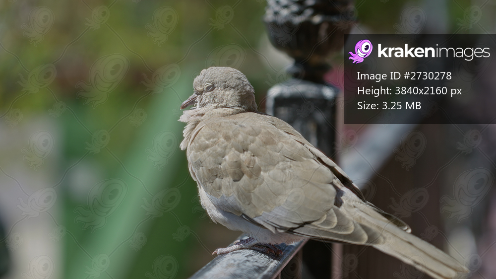Turtledove perched gracefully on a sunny outdoor railing against a vibrant blurred background, capturing the essence of peaceful wildlife in a natural setting. - Kraken Images