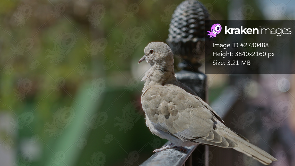 Turtledove perched on a sunlit outdoor railing, surrounded by vibrant green foliage in a serene natural setting under bright sunlight.