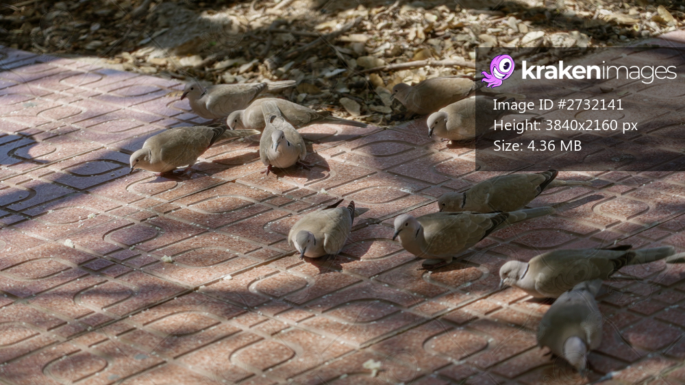 Turtledoves gather on sunlit outdoor tiles, creating a serene nature scene with shadows playing across the red pavement.