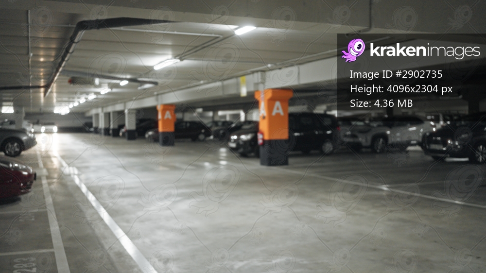 Underground parking garage defocused bokeh interior with soft shallow focus, dim fluorescent lighting and orange column markers; background backplate template calm.