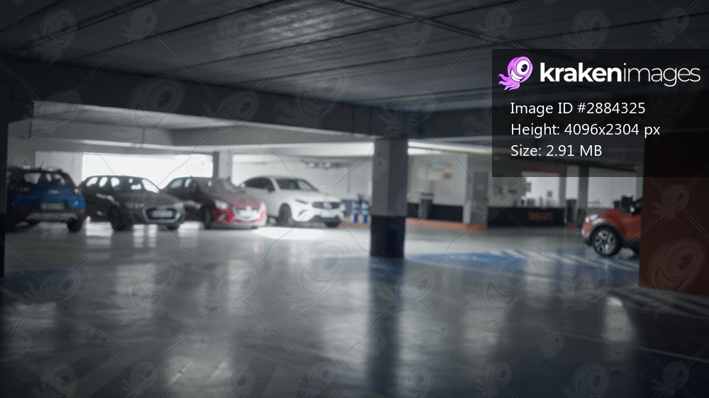 Underground parking garage defocused interior with soft bokeh car silhouettes; background backplate copyspace calm.