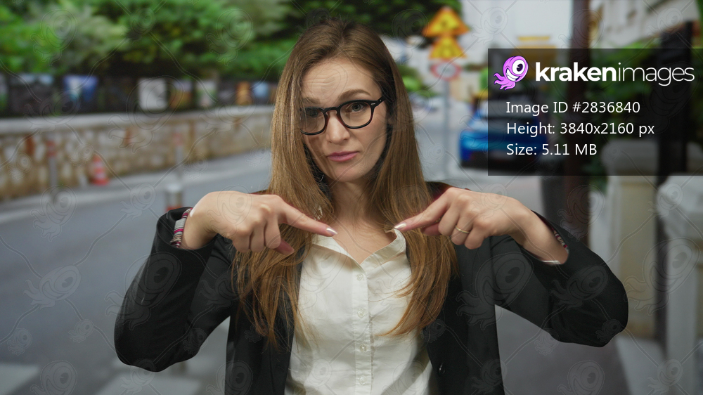 Unimpressed young caucasian woman wearing glasses and blazer finger pointing down on city street; skepticism hesitation questioning doubt.