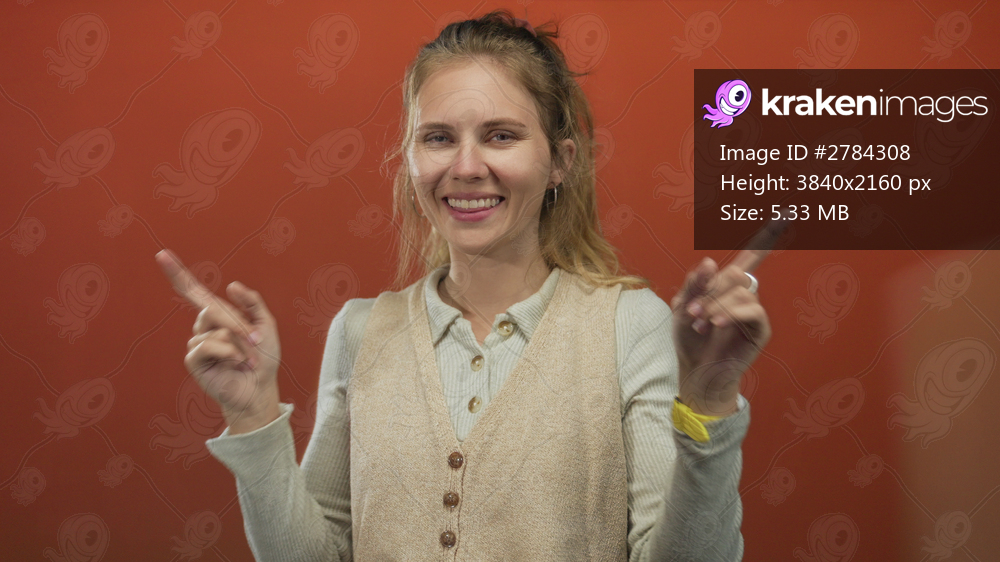 Upbeat editorial features woman finger pointing in a studio with a blonde young subject smiling and laughing against a casual background.