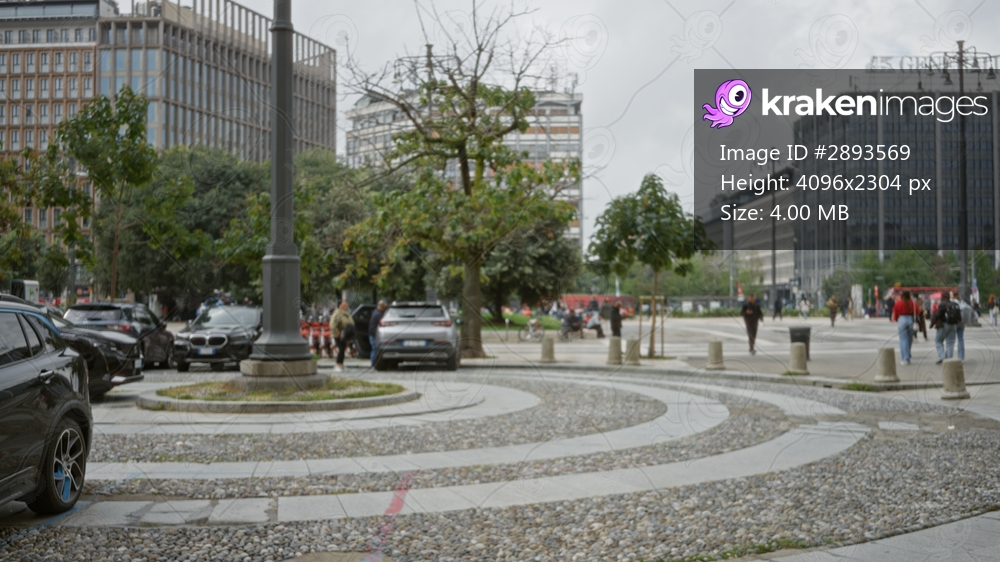 Urban plaza scene with soft shallow bokeh, defocused midground and distant buildings in outdoor plaza; background backdrop copyspace calm.