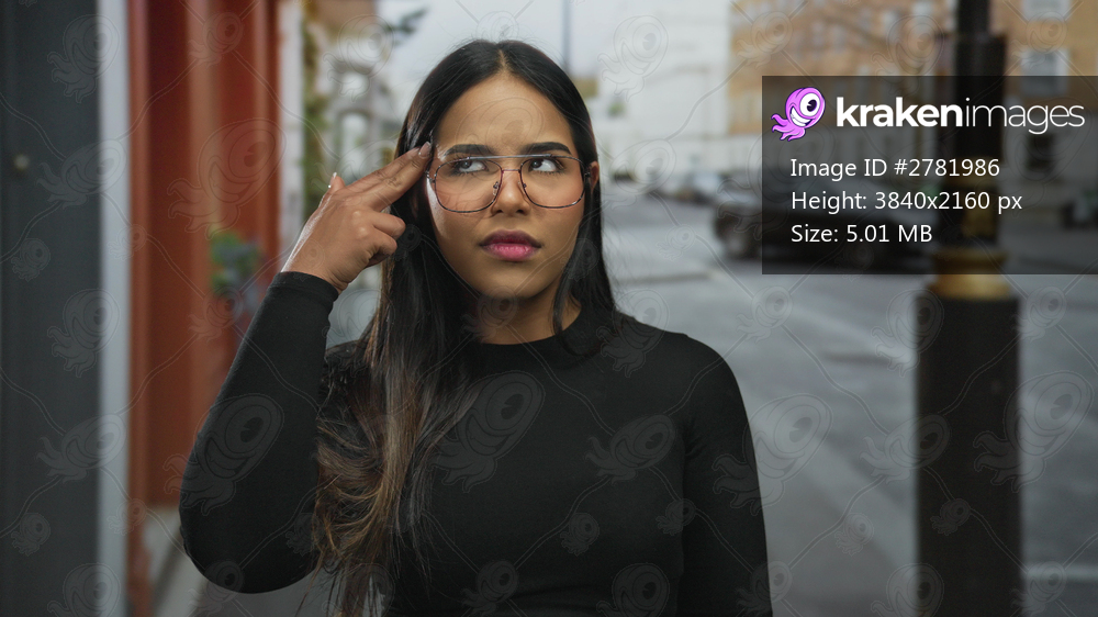 Urban portrait of a woman making a hand gesture in a street scene, a young latin hispanic outdoors figure exuding sarcastic frustration.