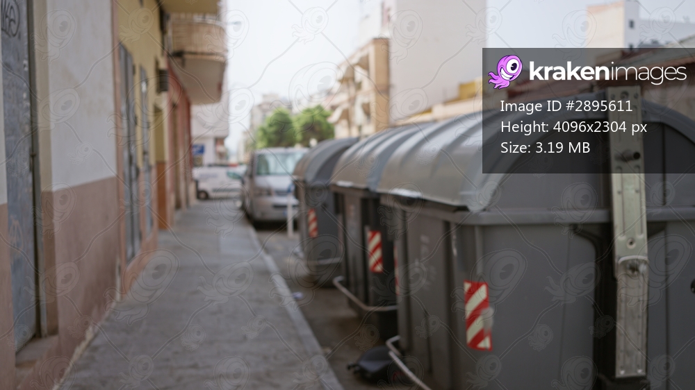 Urban sidewalk scene with defocused dumpsters, blurred van and storefronts in shallow bokeh street; background backdrop copyspace template.