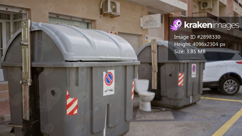 Urban street scene with defocused gray dumpsters and a discarded toilet in shallow bokeh, street; background backplate copyspace calm.
