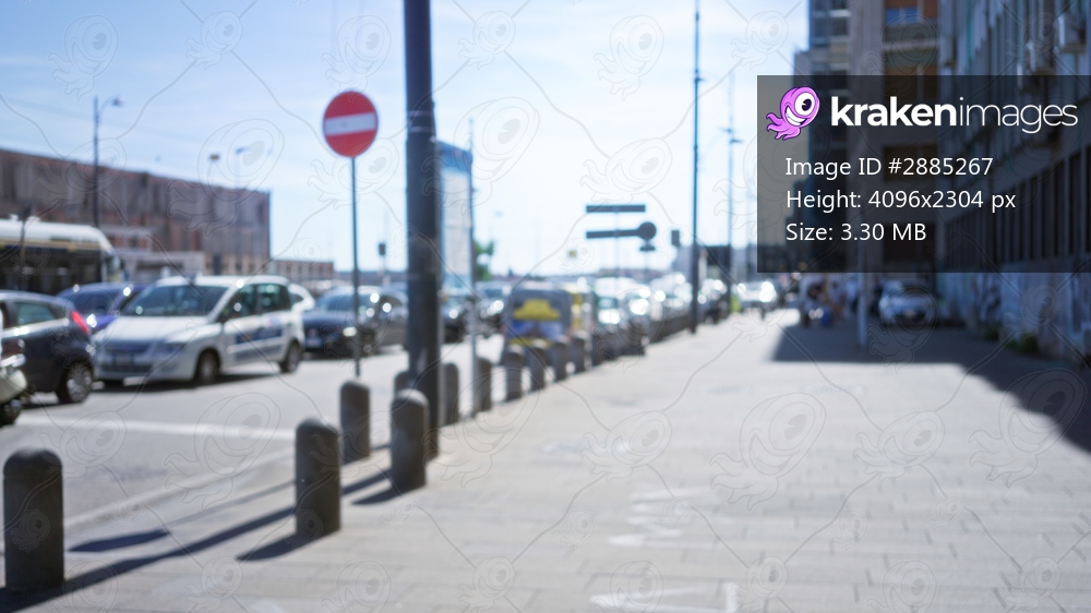 Urban street scene softly defocused with shallow bokeh outdoor; background backplate copyspace calm.