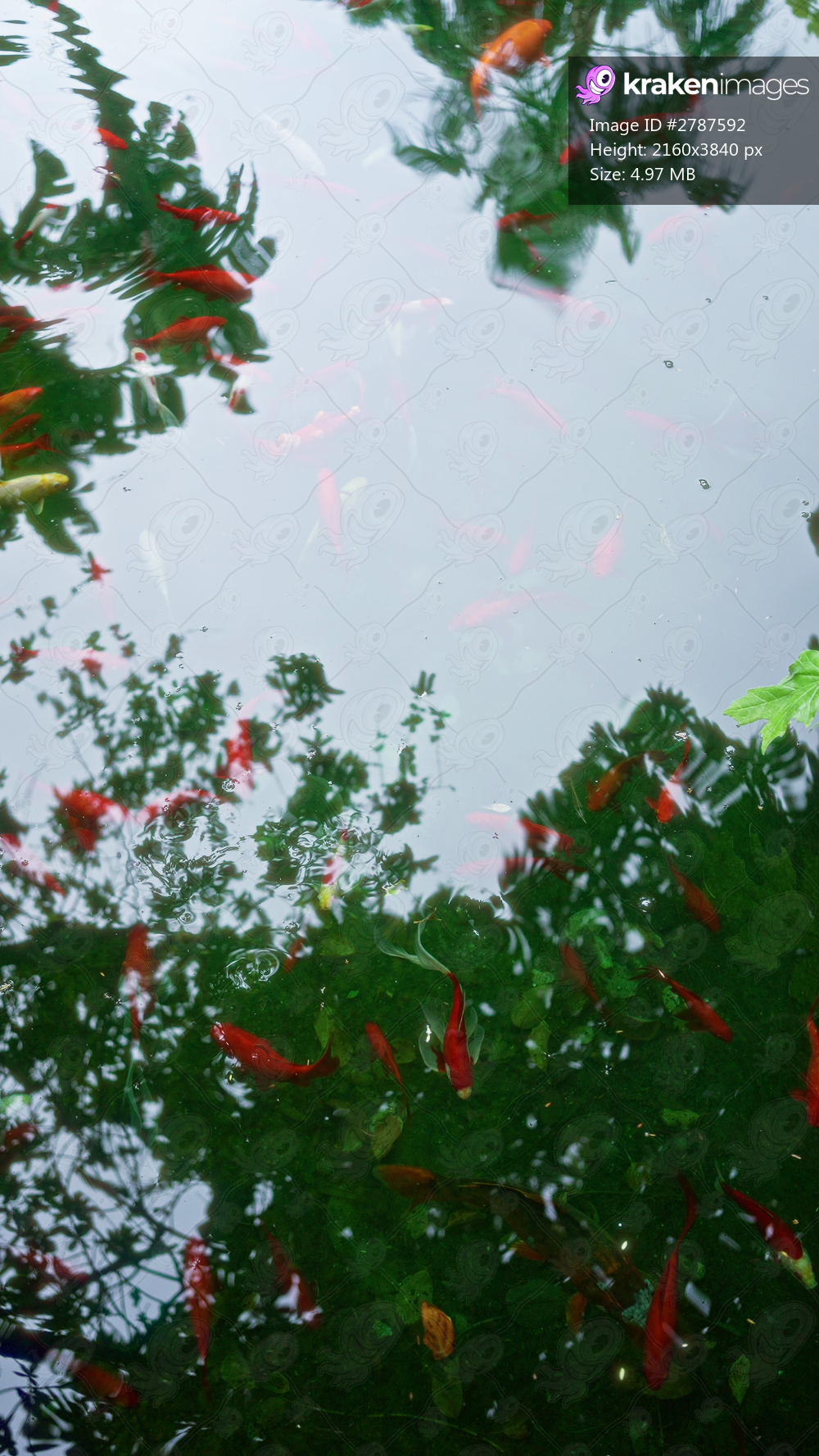 Vibrant carp swimming beneath leafy reflections in a tranquil lake with clear water and diverse fish moving gracefully.