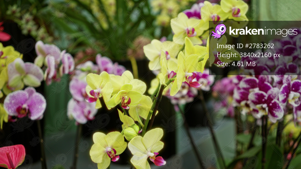 Vibrant phalaenopsis orchids with yellow and pink blooms in a netherlands greenhouse create a stunning indoor floral display showcasing tropical beauty and horticultural elegance. - Kraken Images