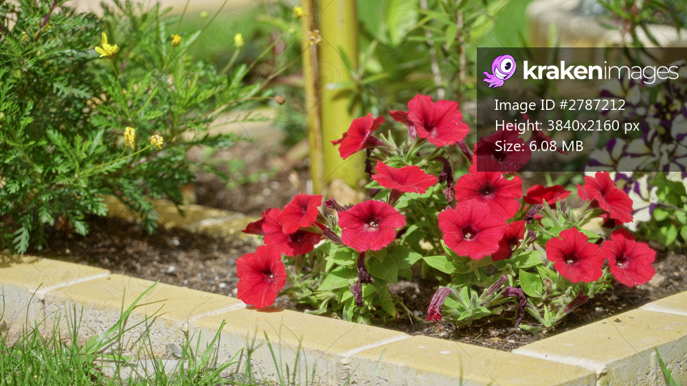 Vibrant red petunias bloom in a sunny garden bed in torrevieja, spain, surrounded by lush greenery and colorful flowers in a bright outdoor setting.