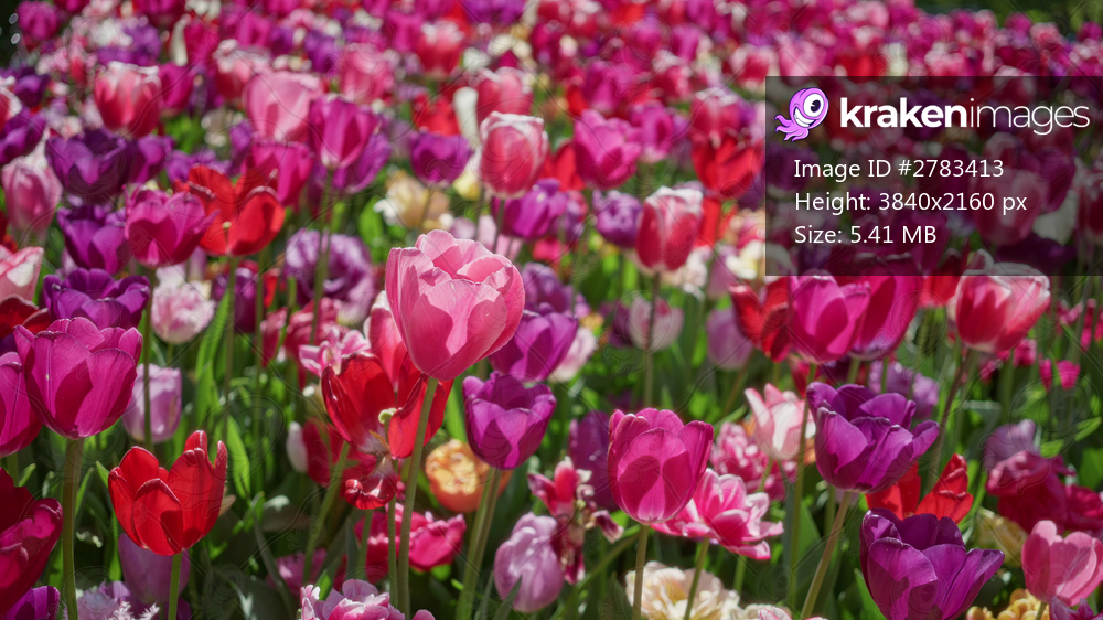 Vibrant tulip field in the netherlands during spring with pink, red, and purple blooms under sunshine