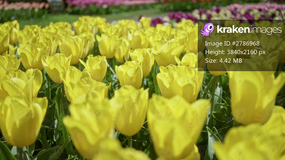 Vibrant yellow tulips bloom in a sunlit garden showcasing lush greenery and bright floral beauty outdoors in the netherlands during springtime.