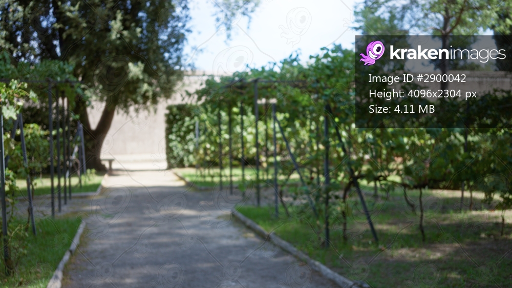 Vine covered trellis and shaded walkway with a distant bench and boundary wall rendered in soft defocused bokeh, garden; background backplate copyspace. - Kraken Images