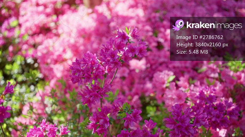 Vivid magenta azaleas in full bloom create a vibrant floral display outdoors in a dutch garden, with sunlight highlighting their delicate petals against lush green leaves - Kraken Images