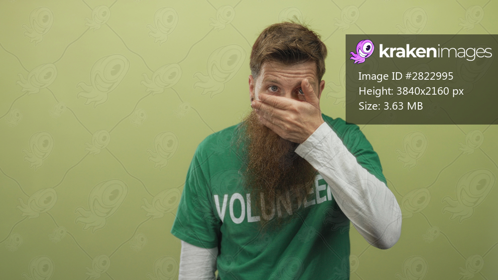 Volunteer man with beard wearing green shirt covers mouth with hand in studio; silence suppression secrecy restraint.