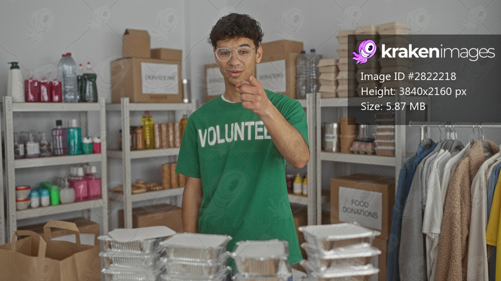 Volunteer man with finger pointing to stacked food trays at donation center building; compassion community support generosity.