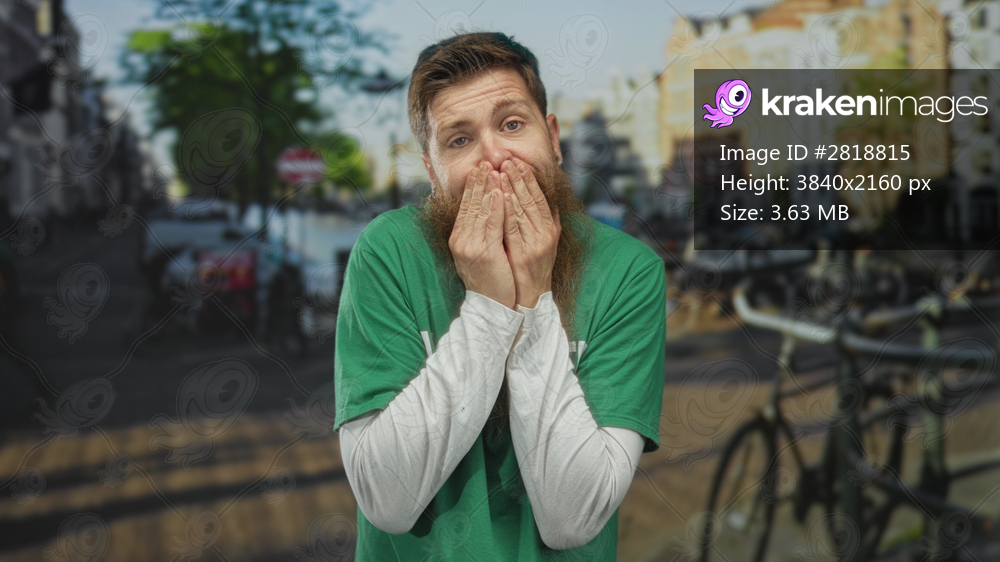 Volunteer man in green shirt covers mouth with hands on city street beside canal and parked bicycles; surprise.