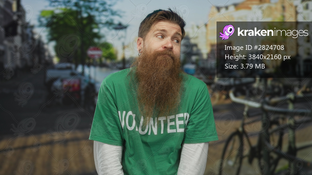 Volunteer man in green shirt covers mouth with hands on city street beside canal and parked bicycles; surprise.