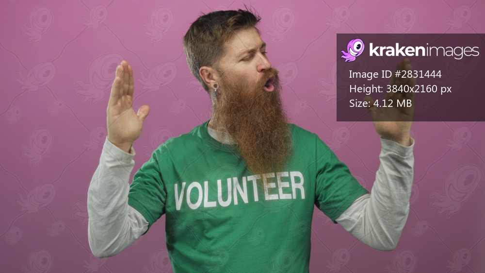 Volunteer man with long beard raising hands with open palms wearing green volunteer shirt in pink studio; optimism community support.