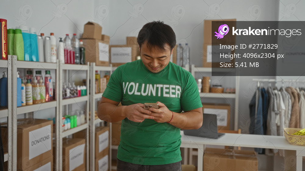Volunteer man taking selfie in donation center surrounded by boxes and supplies showcasing charity work environment