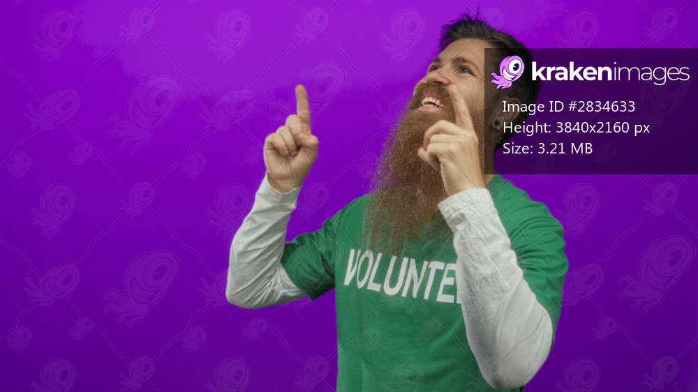 Volunteer man wearing a green volunteer shirt points both index fingers upward and smiles brightly in a purple studio; hope.