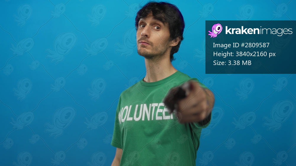 Volunteer man wearing green volunteer shirt finger pointing to camera in blue photo studio; motivation.