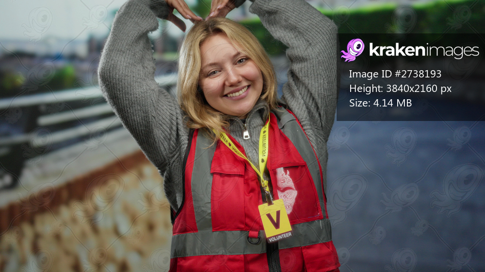 Volunteer woman with blonde hair making heart symbol on city street, wearing red vest and smiling outdoors during a community event.