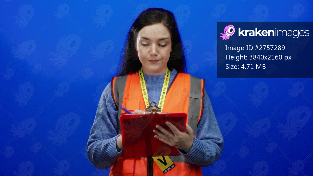 Volunteer woman with brunette hair in an orange vest takes notes on a clipboard against a blue background, illustrating dedication and focus in community service. - Kraken Images