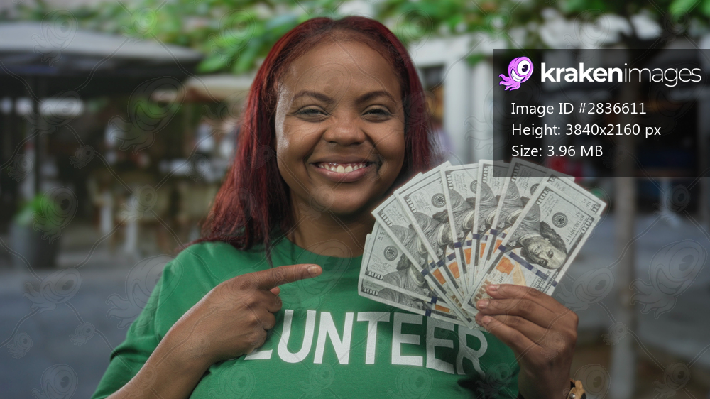 Volunteer woman holding a fan of us dollar bills and pointing finger at the cash on a busy urban street; generosity.