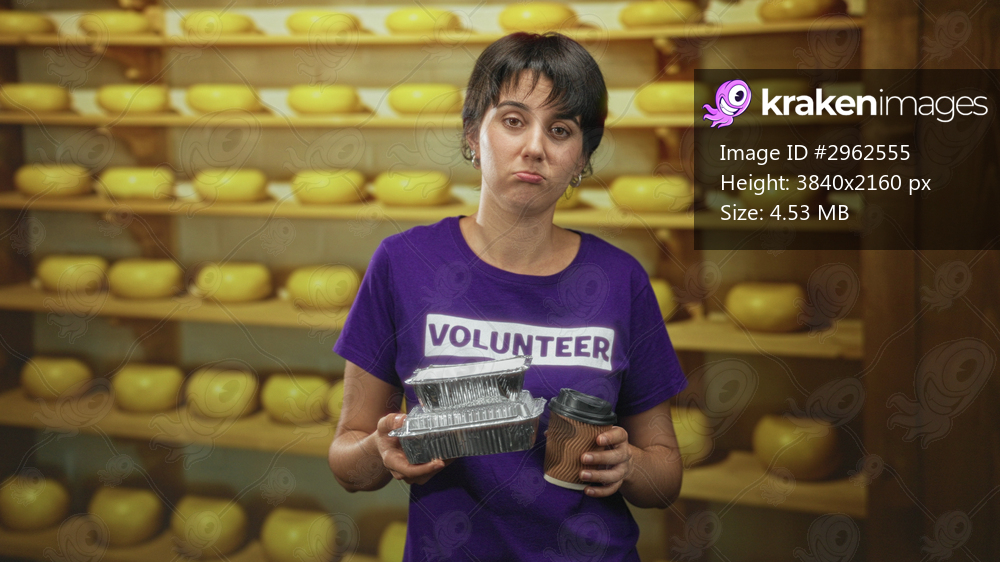 Volunteer woman holding foil food trays and a takeaway coffee cup, pouting with hands visible among cheese shelves in a storage building; quiet resignation. - Kraken Images