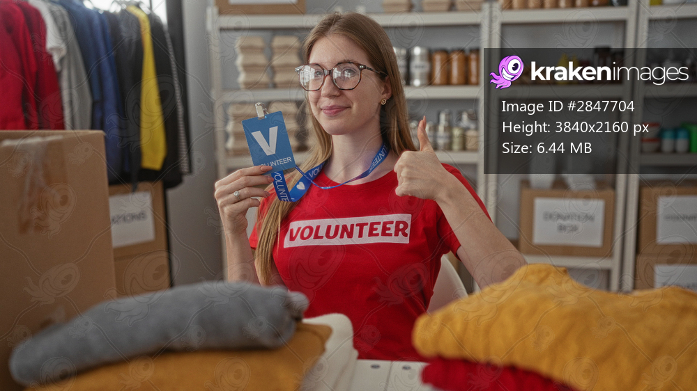 Volunteer woman holds badge while sorting donations and smiles in building; community care solidarity kindness.