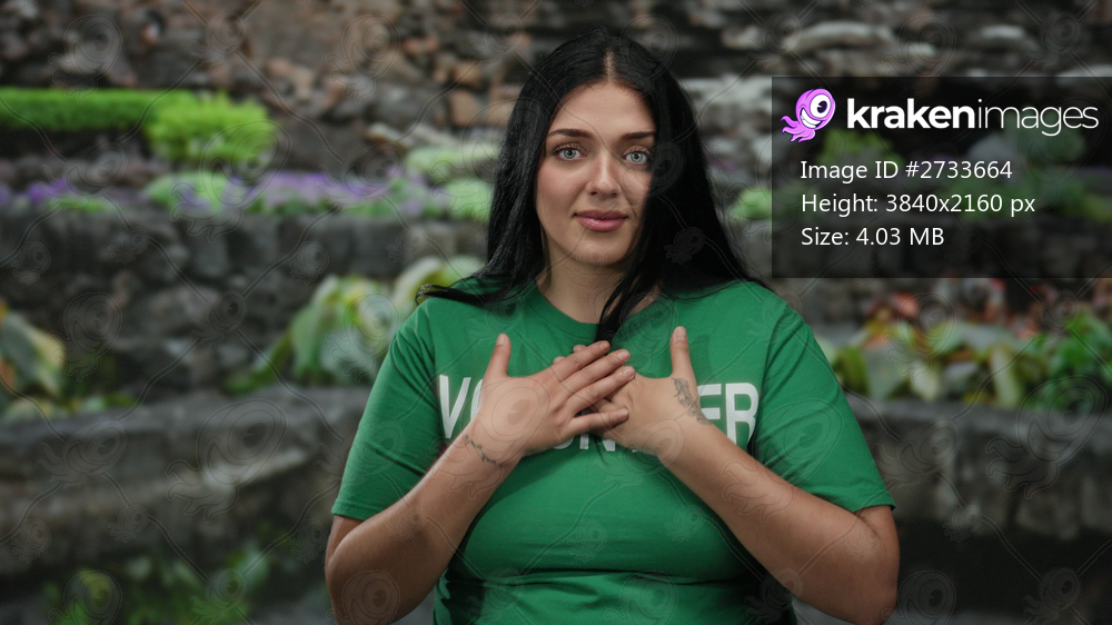 Volunteer woman in green shirt with tattoo gestures emotionally in outdoor park setting surrounded by nature and greenery conveying a heartfelt message. - Kraken Images