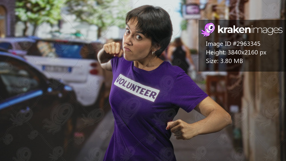 Volunteer woman in purple shirt clenches fists and presses hands together on a busy street; determination resilience.