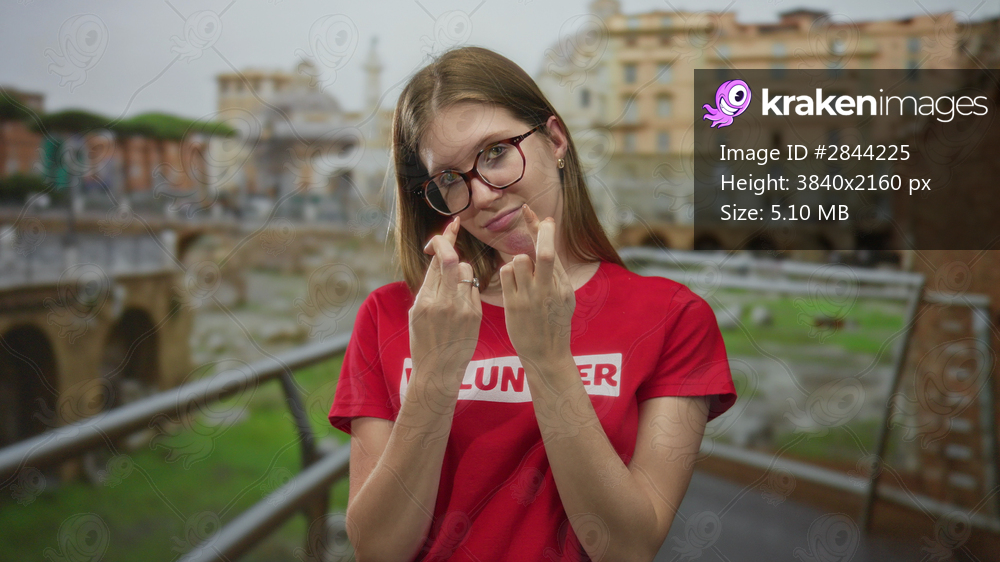 Volunteer woman in red shirt crosses fingers at ancient building overlooking roman ruins; optimism solidarity.