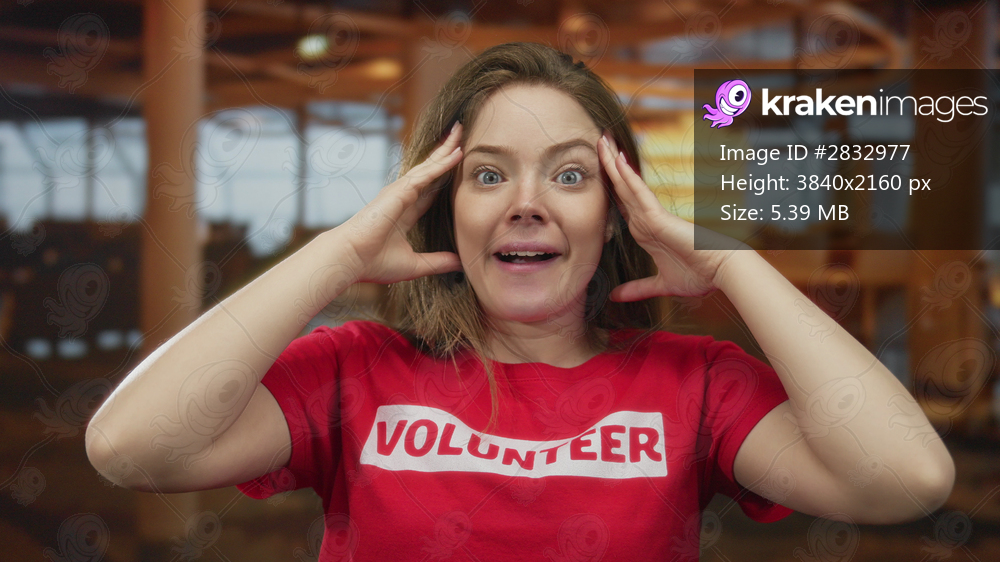 Volunteer woman in red shirt raises both hands to temples, frames face with palms inside modern building atrium; surprise.
