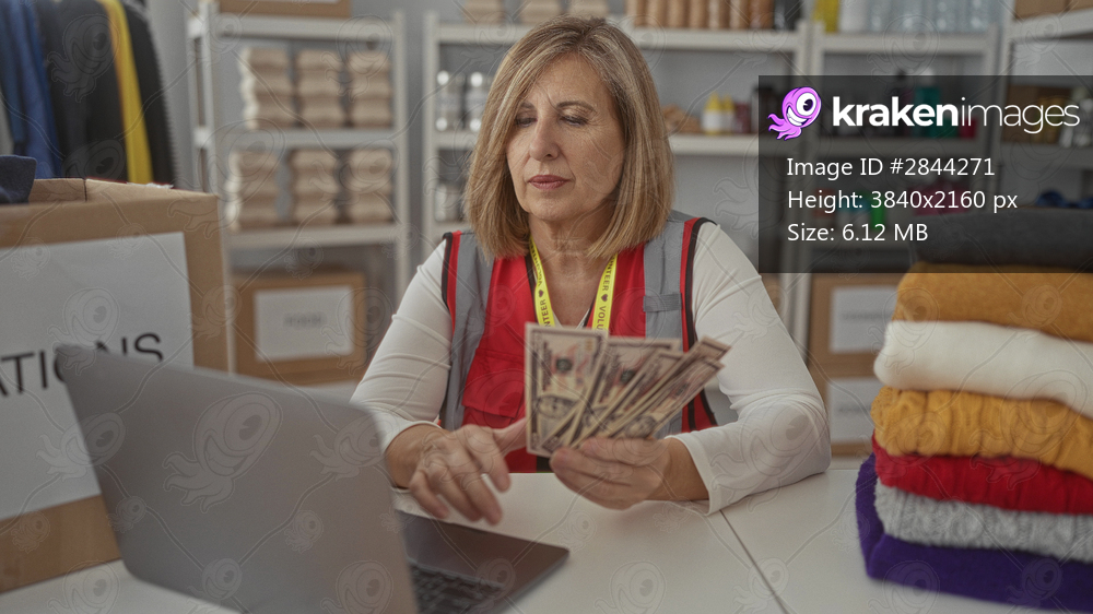 Volunteer woman in red vest carefully counting cash at donation table inside building; charity dedication.