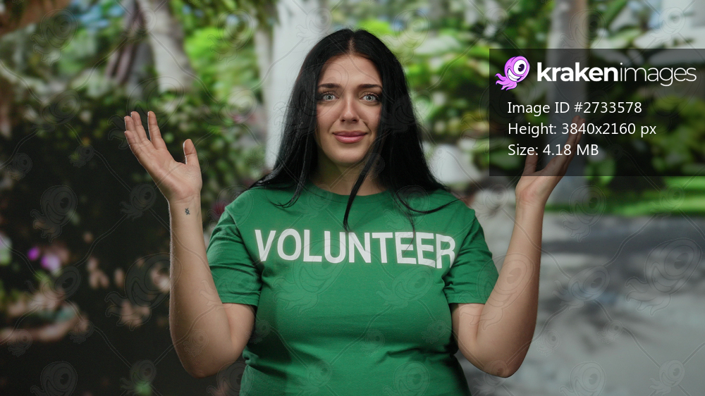 Volunteer woman with long hair in green shirt smiles in a lush park setting, embodying youthful energy and diversity.