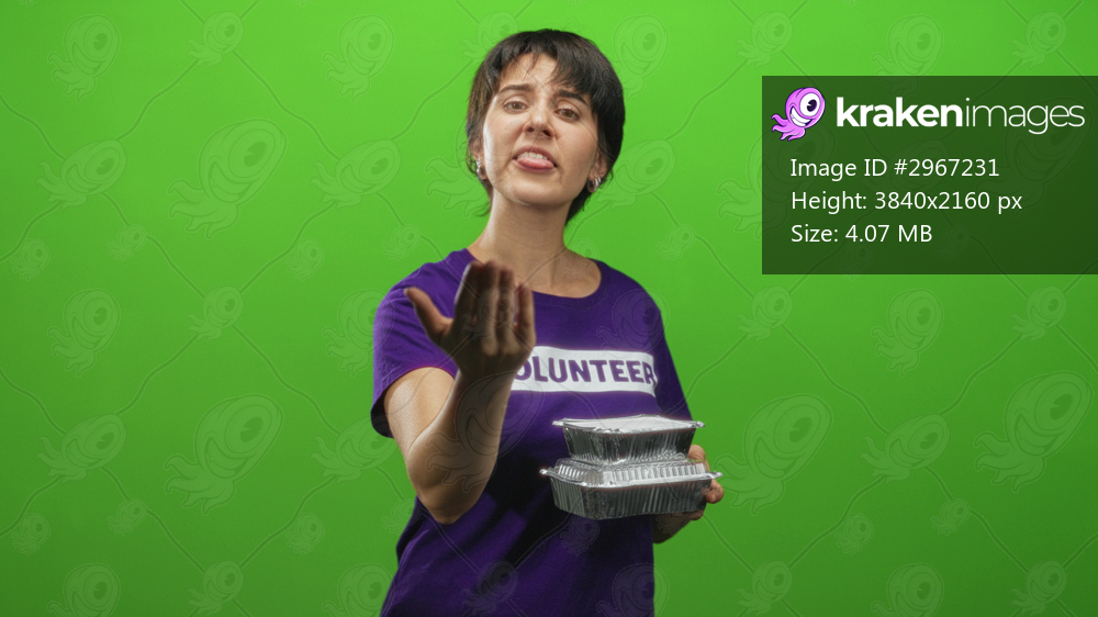 Volunteer woman offers foil food containers and beckons with hand in studio; compassion outreach community aid.