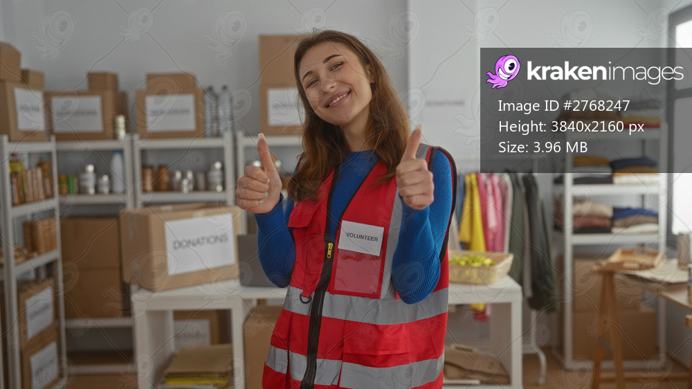 Volunteer woman smiling and giving thumbs up in a charity donation center surrounded by boxes and clothing, showcasing a positive humanitarian environment indoors. - Kraken Images
