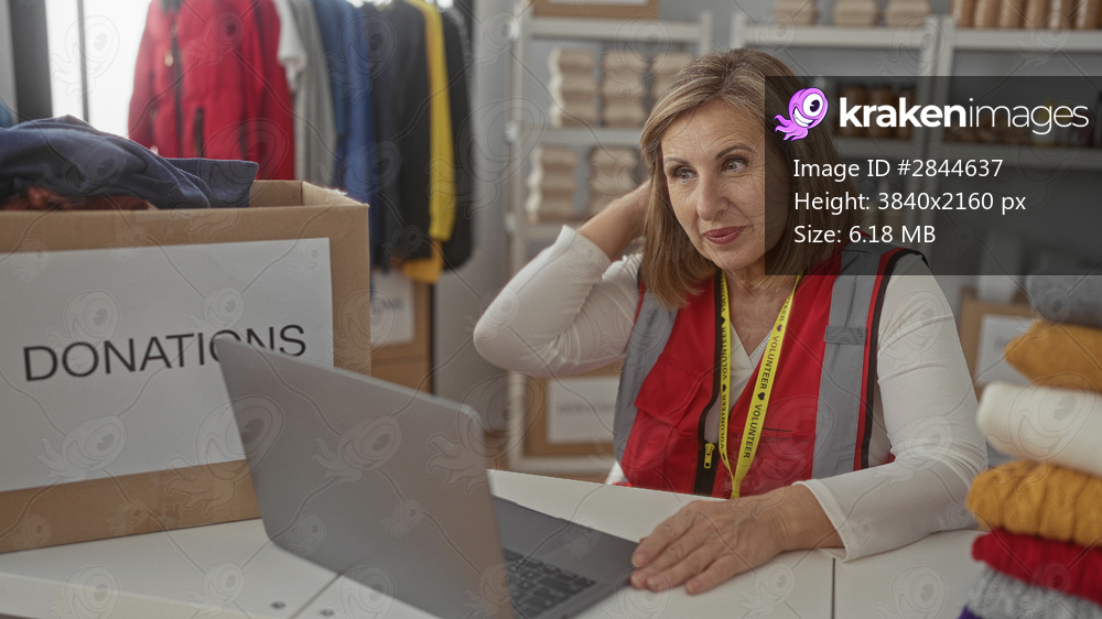 Volunteer woman typing on laptop with hands next to donation box in building; generosity compassion.