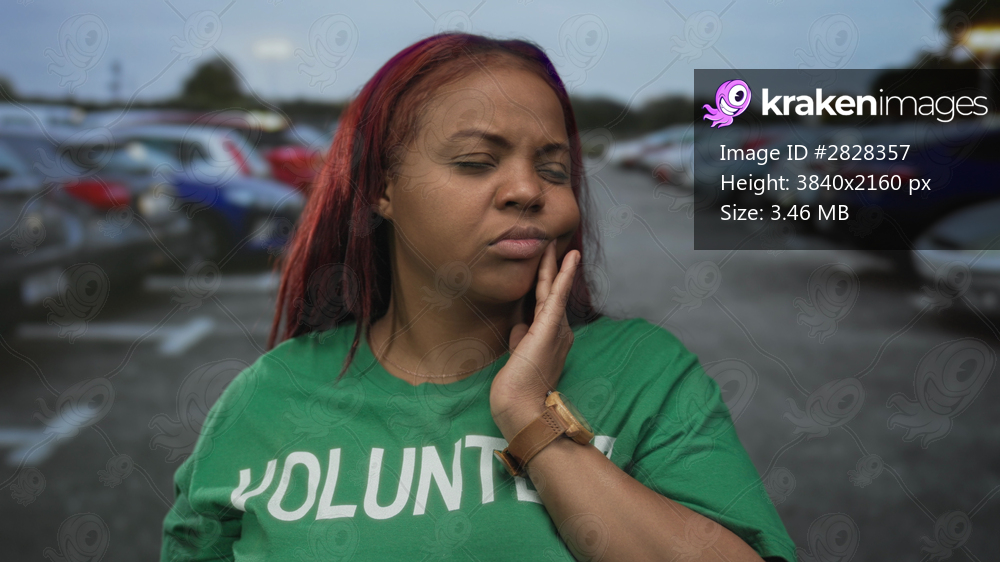 Volunteer woman wearing green shirt holds cheek with hand for toothache next to car by building; discomfort.