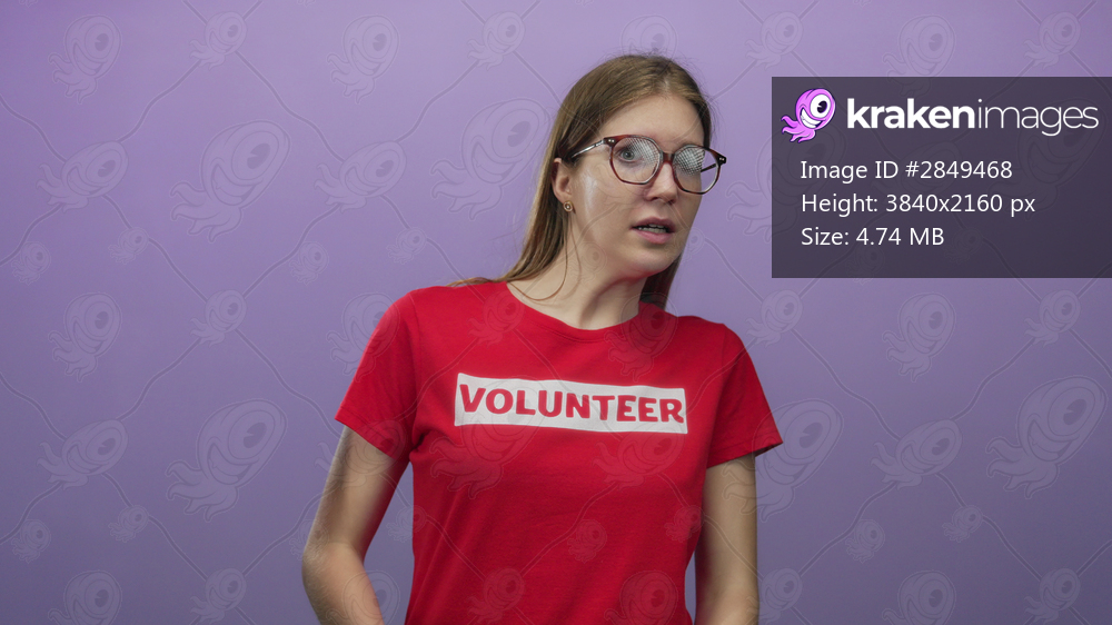 Volunteer woman wearing red shirt covers her mouth with hand and lifts her other hand in purple studio; fear.