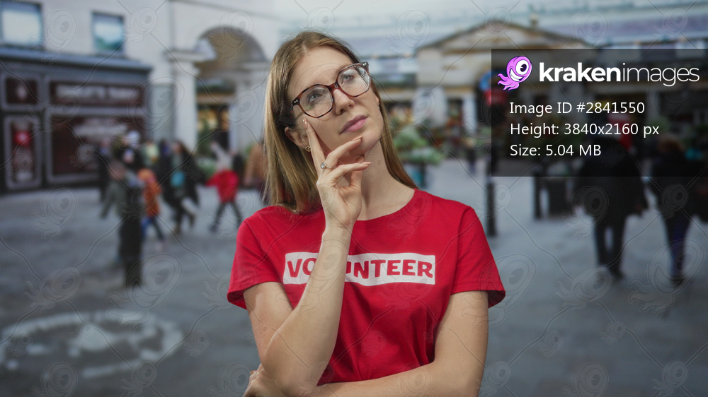 Volunteer woman wearing red tshirt and glasses touches cheek on bustling urban street; quiet introspection.