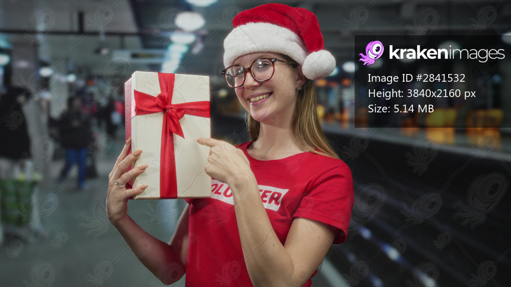 Volunteer woman wearing santa hat and red shirt pointing finger while holding large gift box in building; holiday generosity.