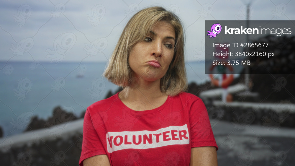 Volunteer woman wearing volunteer shirt pouts lips against gray sky by rocky coast outdoors; indifference.